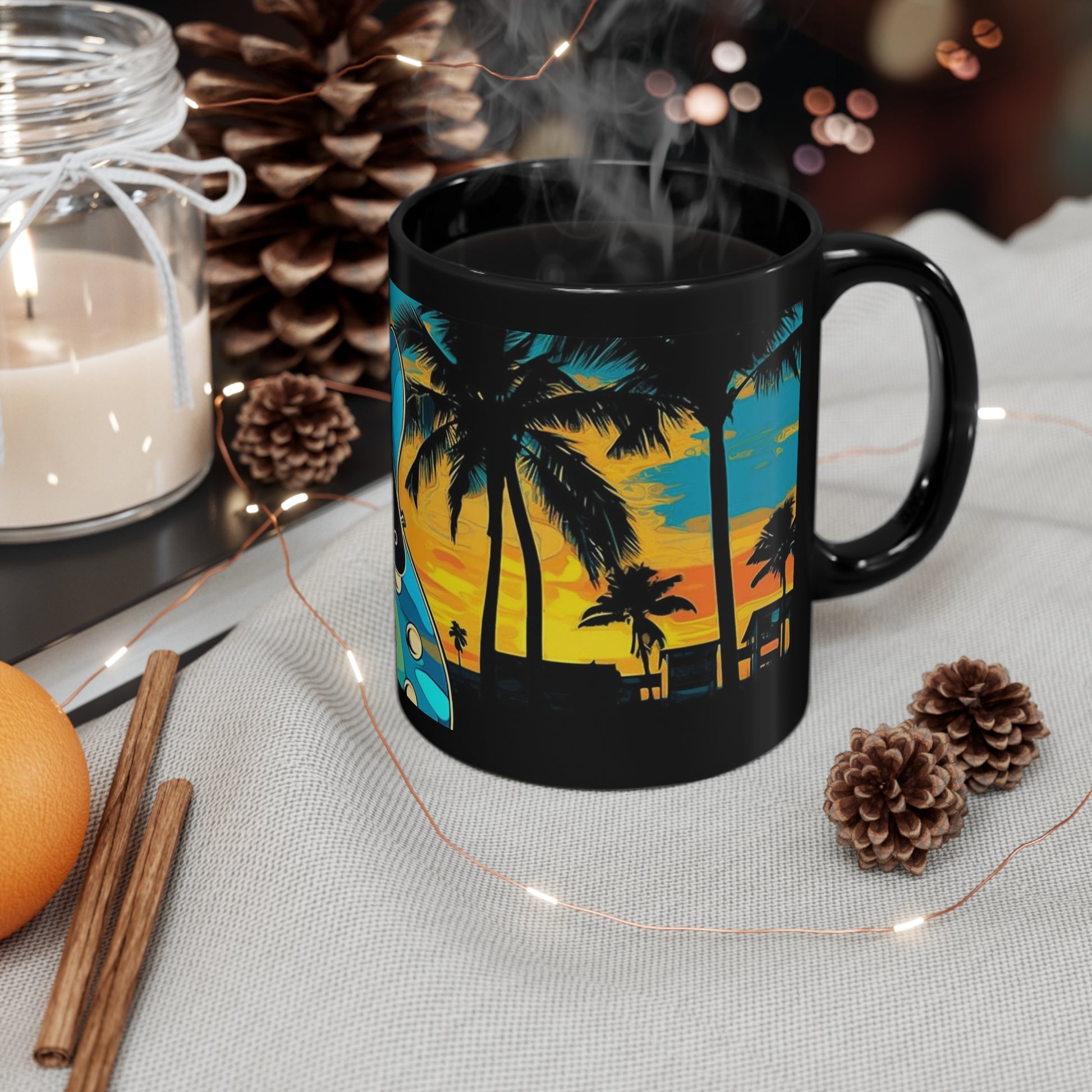 Warm your soul while sporting your style with a nice cuppa whatever makes you smile out of this perfectly sized black ceramic mug. It has a vibrant tropical blues guitar scene, perfect for a sunny morning mood! It’s BPA and lead-free, microwave and dishwasher-safe, and made of black durable ceramic in 11-ounce sizes. The high-quality sublimation printing makes this black ceramic mug the perfect gift for your true coffee, tea, or hot chocolate lover.